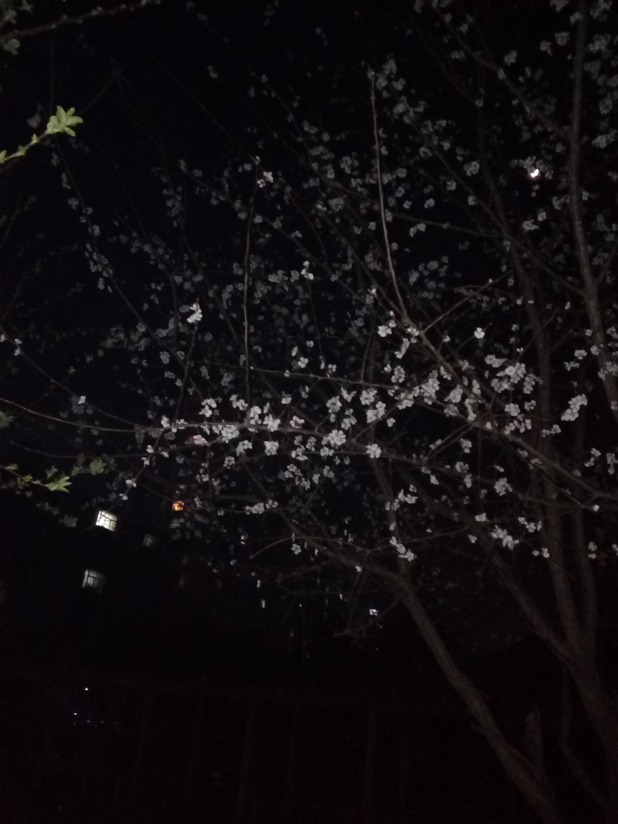 注:散步于楼前花园小径,灯光恰照眼前头上花满几树,想起白天窗外鸟鸣悦人,正怡然悦赏,忽更见花枝间一轮明月,顿诗兴油然而生,得此诗。